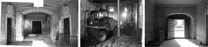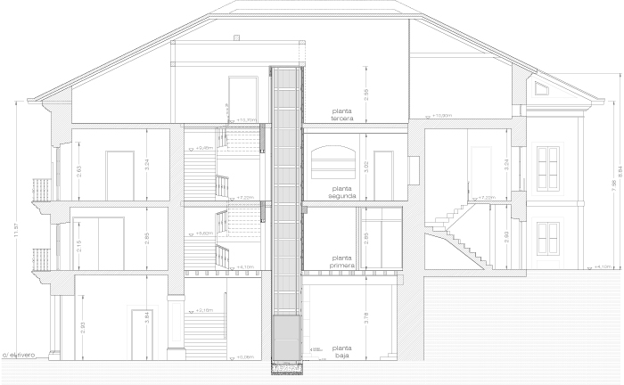 Debido al tipo de construcción de la casa, los muros de carga de la estructura principal disminuyen su espesor a medida que ascienden, lo que reducía el espacio disponible en la planta inferior. Se encuentra además, que los elementos estructurales de madera no coinciden al superponerlos, debido también a reformas llevadas a cabo a lo largo del tiempo. En el emplazamiento más adecuado para el funcionamiento actual de la vivienda y con las máximas dimensiones resultantes, se consiguió resolver la instalación cumpliendo todas los requisitos iniciales y sin modificar la estructura existente.